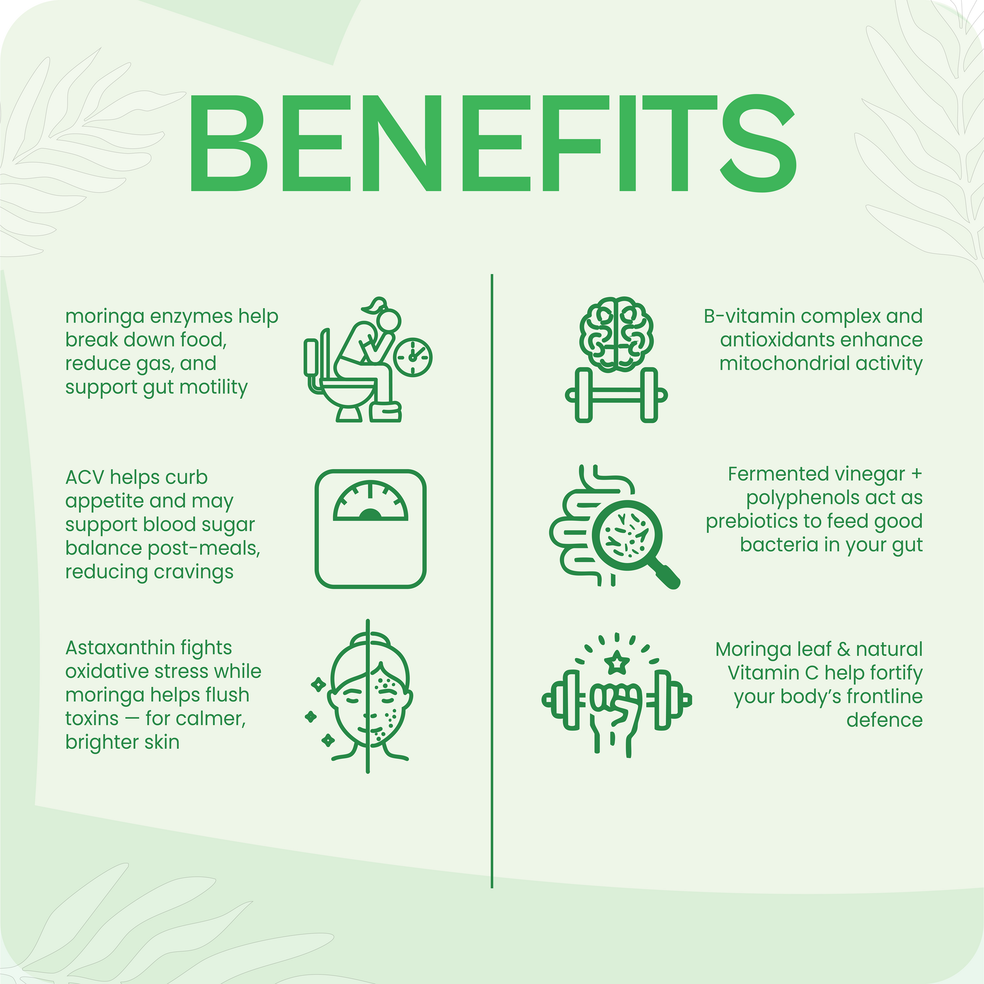 - Infused with 6% Apple Cider Vinegar (ACV) and the goodness of Moringa.